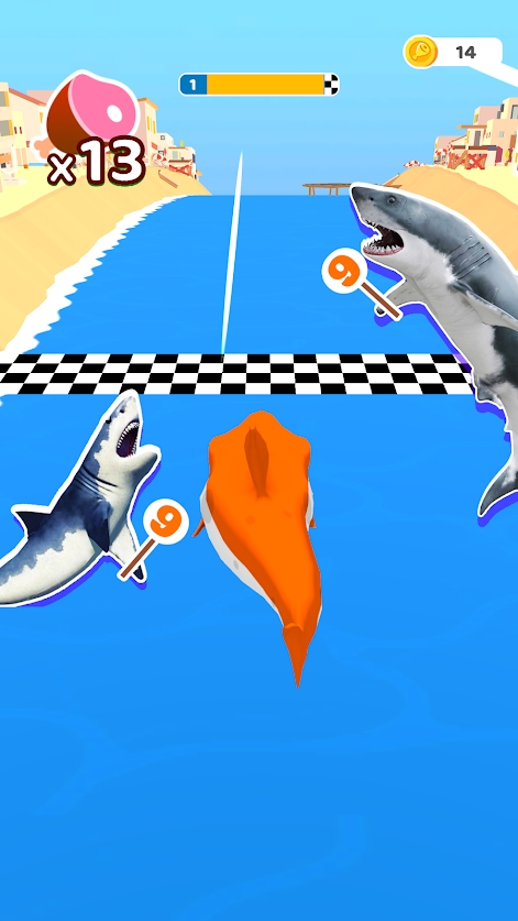 鲨鱼跑游戏是一款卡通3D风格的跑酷闯关游戏。操控鲨鱼在河流之中跑酷,吞噬河道中的小鱼,这样可以加速你的跑酷速度,获得的奖励可以解锁各种不同造型的鲨鱼,购买使用不同的道具,让自己可以快速的抵达终点,轻松有趣的鲨鱼跑酷,快来体验吧!