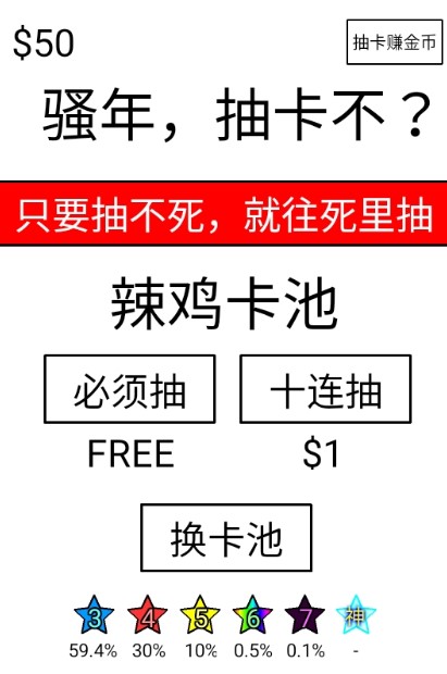 抽卡到死是一款非常有意思的休闲游戏,玩家在游戏中开始自己的抽卡战斗之旅,不断的抽卡变强,并且和怪物战斗来赚钱。简约无比的画面。