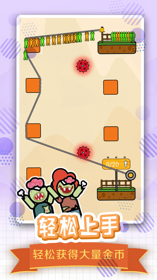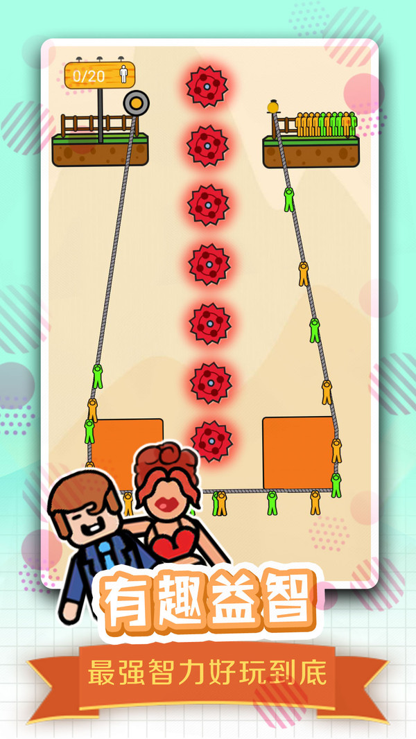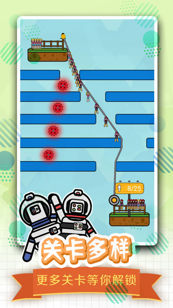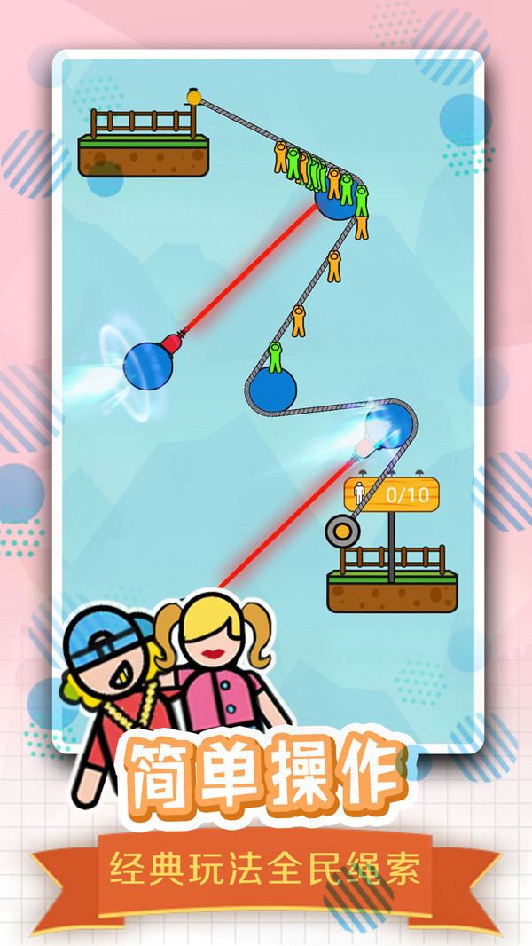 全民绳索营救是一款益智解谜休闲类游戏,玩家可以通过绘制线条变成绳索,将场景内的起点与终点链接起来,帮助他们解救被困住的人,玩家需要仔细观察场景,选择最优的方式营救。