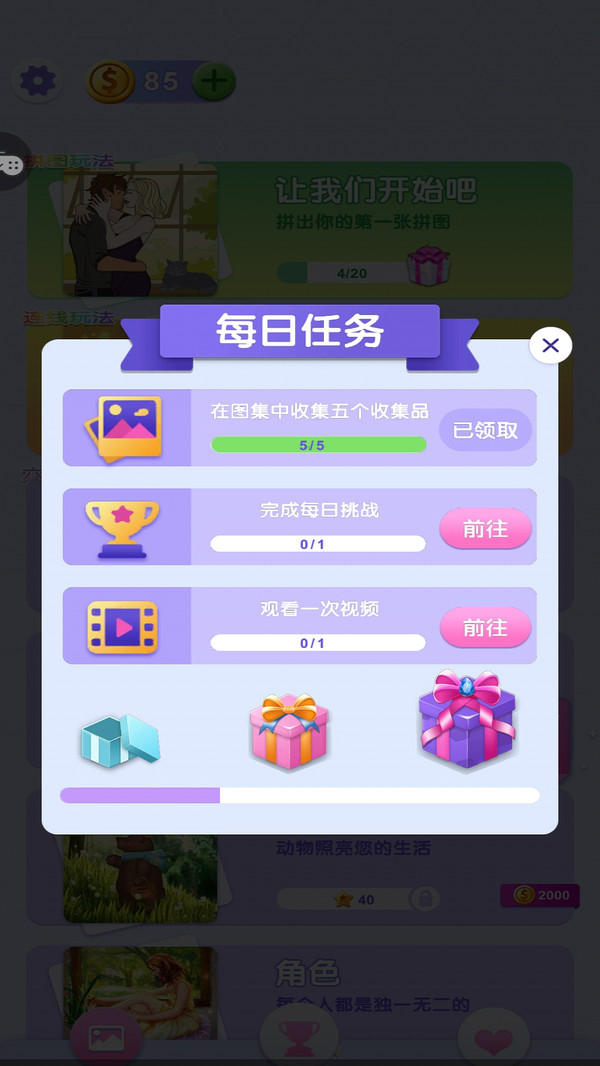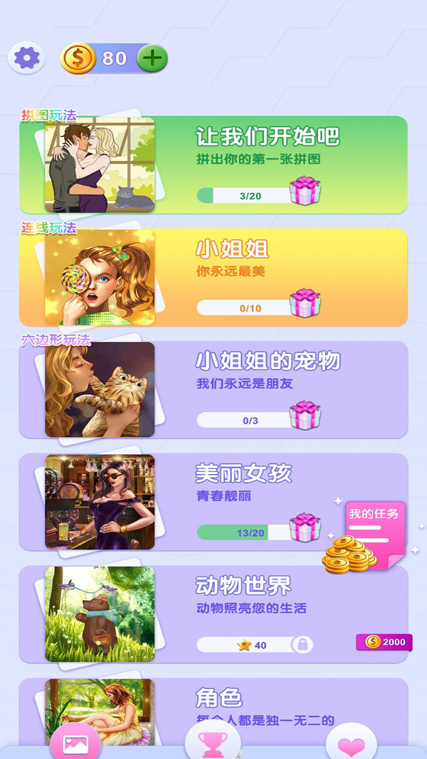 拼出一个小姐姐是一款休闲益智拼图类游戏,非常有趣的拼图游戏,有许多精美的图片,玩家通过观察拼图上破碎的图案,拼出风景或者小姐姐,完成关卡获得奖励。