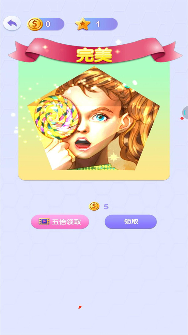1、拼成一个漂亮小姐姐将全部碎渣先后拖动至上边六边形构成的范围内,就可以获得一副完整篇的精致作品,可储存至相册图片,玩法简易易实际操作。