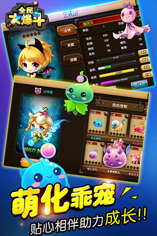 全民大爆斗以Q版人设,精美场景原画,为萌新们打造了一个生动活泼的游戏世界,从主场景的各种建筑,到 “呆萌”的角色、“激萌”的宠物,任何一点都能萌杀宝宝们的心。细腻原画加上Q到爆的角色,给你不一样的萌新之旅!