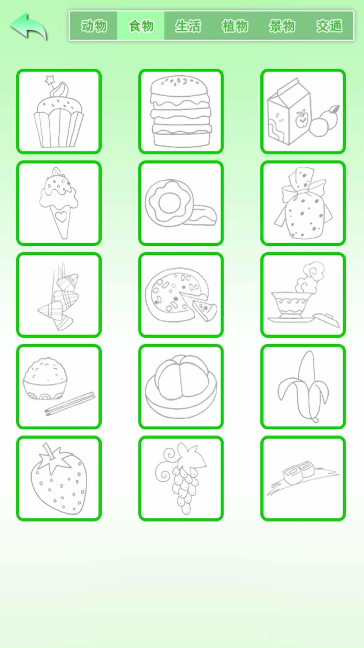 4、学习方式,提供动物、食材、绿色植物、景色、日常生活、交通出行六大归类不一样图片开展制图学习培训。