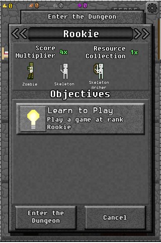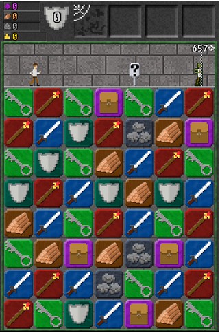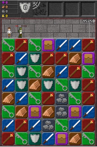 跟全世界的像素风冒险游戏一样,冒险家在地牢里不断遇到各种障碍,怪物、守卫、宝箱、紧锁的大门,而行动的方式不再由玩家直接控制,而是要通过玩屏幕下面的三消游戏才能让主角有所动作,面对怪物当然是消除剑和魔法杖来攻击了,用一组盾来防守也可以,遇到宝箱就消除钥匙,基本上需要什么就划动屏幕来消除什么。三消的方式是纵向和横向拖动,老实说一开始挺难适应的,做到消除很简单,但是经常刷不出你要的图案很令人捉急啊啊啊~~~