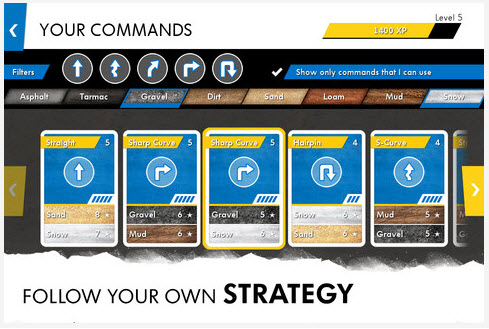 咱们要做的,就是在车移动至箭头带的瞬间点按正确的90度转弯、180度转弯等命令卡牌,让汽车采取相应的动作。根据玩家点按的时机会有好、完美的评价,也会得到不同的能量值,这能量值可使用些更强力的转向卡牌。根据玩家时机的把握和卡牌的选择,会有不同程度的加速或减速效果。最终目标嘛,当然还是和竞速游戏一样,看耗时啦!在刷图升级后,能获得更多特殊属性卡牌,玩家在游戏前需选择安排好自己的牌组。强力卡牌使用会消耗能量值,当然也会带来更多收益。不同的强力卡牌会有不同的赛道适应力,比如有的牌适合沙地、雪地,有的牌适合马路等等。在选择关卡牌组时需考虑到这些因素。