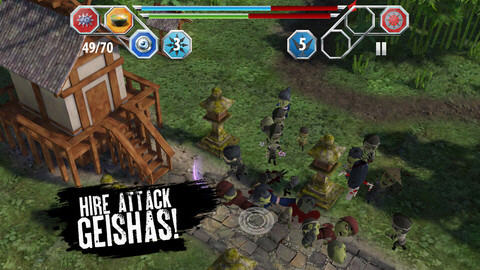 这款游戏的画面设计比较用心,无论是从人物的造型,场景的构造甚至僵尸的特点都可以看出其精细之处!主角的造型采用比较夸张的手法,头大身子小,手握忍者专属的武器,再配合其严肃的表情,还是比较有趣!在游戏中,僵尸的死亡方式大多数都断头,配合流出的血液,看上去还是较为血腥的。