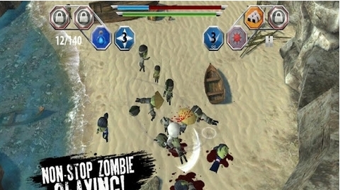 关卡制是许多动作类游戏常见的设定,本作也不例外。玩家需要完成每幅地图的全部三个任务,才能进入到下个关卡。虽然是动作类游戏,但它的操作并不复杂。玩家只需点击屏幕任意位置即可操控主角移动,在屏幕上任意划动弧线,即可实现最普通的攻击,在蓝色弧线范围的僵尸一一毙命。除了普通的攻击技能,忍者还配有远距离击杀的忍者镖技能和近身的群攻技能。点击任意僵尸可发射忍者镖致其于死地。当一大波僵尸围攻时,玩家只需要点击扮演的忍者角色,就能触发群攻技能,周遭僵尸无一能幸免。当然这两项技能并不是随时都可用的,当三次使用完毕,只有等到其自动恢复方能使用。屏幕上方有一个蓝色的能量积蓄池,玩家的普通攻击的威力与它的长短有关,能量可自动恢复。