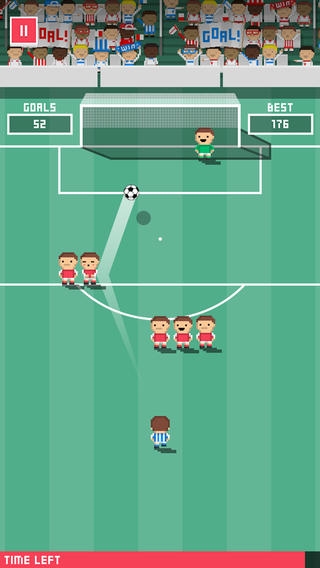小小射手的玩法很简单,就是用手指划出你要让球飞行的路线。目标是在时间限制内,踢进尽可能多的球。游戏有两大特点和以往的射门游戏不同:其一是弧线非常清晰,玩家可以从球的飞行轨迹判断出自己之前操作的弧线是怎样的。在踢球时,玩家划出最初的一段飞行轨迹后,后面的轨迹由算法自己判断,有时甚至会踢出完美的C型弧线球,很是诡异。在某些关卡,还需要玩家将球踢到人墙边缘,形成折射后入网。如果被难住了,就想想折射吧。
