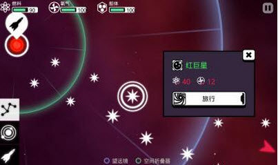 首先是星图上大小的两个圈,蓝圈代表着你可以到达的星系;红圈代表着飞船可以侦测到的星系。舍近求远,还是一步一个脚印就看你自己的选择啦。但是请大家看界面顶部的三个数值,分别为燃料储备,氧气储备,装甲防护。这三者将是制约你顺利返航最大的因素。所以你就多了一个探索各个星球资源的重大任务!