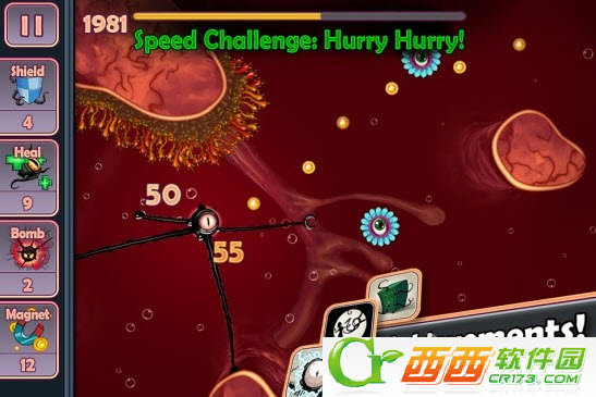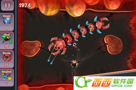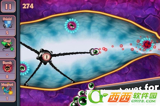 毫无疑问我们在前进的过程中会遇到各种类型的阻碍,无论是固定的如器官内壁收缩、体液流动以及锋利的毒牙,还是随机性较大的大型细胞,都会对眼球怪造成很大 的威胁,玩家要利用好触手来进行躲避。后期随着剧情发展,海豚博士会给自己注射药剂,看着药剂紧紧尾随身后的紧张感也不言而喻。另外,大家熟悉的大脑、扁桃体等器官在游戏中也化身成为邪恶的 Boss 等待着玩家去挑战。
