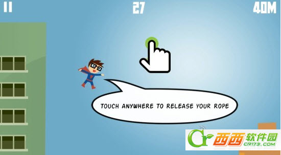 绳子超人 Rope Man Swing n Fly Superhero是一款有趣的休闲小游戏。游戏玩法很简单,点击开始,超人会向前飞,再次点击屏幕,超人会像蜘蛛侠一样射出一根绳子,利用这个绳子做钟摆运动。再次点击屏幕,超人会断开绳子。利用这样的方式,向前飞行。