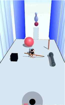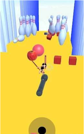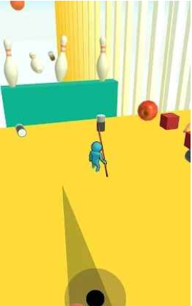2、并通过挥舞手中的棍棒来击飞界面上的物品,从而打中保龄球;