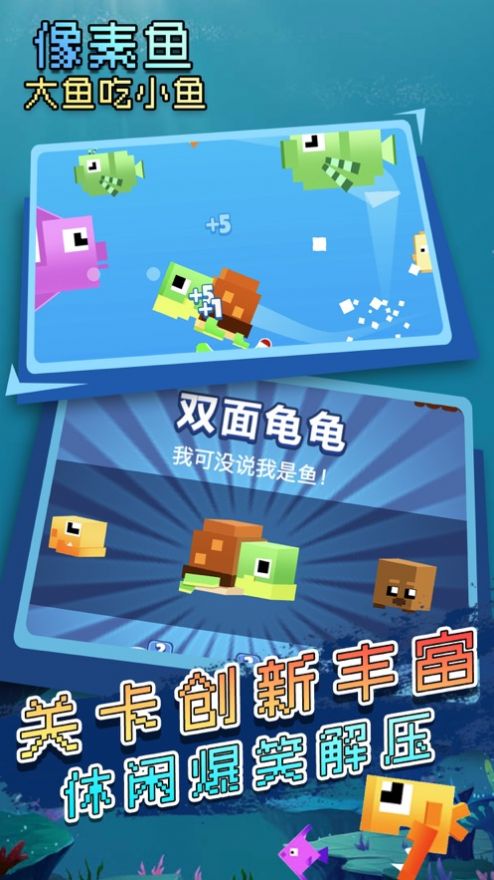 大鱼吃小鱼像素生存游戏是一款采用简单可爱的像素风图形打造的趣味指尖吞噬进化挑战游戏。在各种不同的关卡之中开始你的吞噬进化挑战吧,我们需要进入到各种不同的关卡之中来吞噬各种非凡的鱼类,这里有着很多造型别样的鱼儿设定,在进行吞噬的时候一定要找好目标,快速的将目标吞噬。