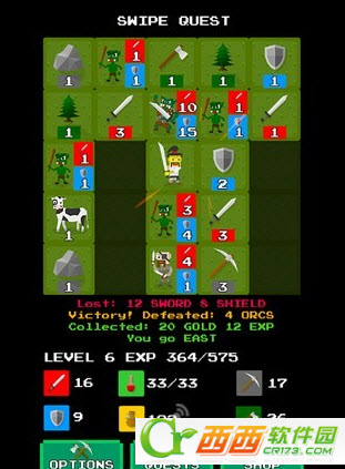 保卫任务 Swipe Quest一款具有很强策略性的 RPG游戏,首先选择男女战士、男女阿拉伯战士其中一人开始游戏,每个人的初始能力都不同,玩家将会在一片广阔神秘的大陆上进行冒险,这片大陆潜藏着巨大的危险,随时随地都会出现各种可怕的敌人,而游戏中的一切都将会是随机出现的,玩家永远都不会知道下一条路上会出现什么东西,无论是道具亦或是敌人,玩家需要不停的探索这片大陆,最终向邪恶的巨龙进行挑战。