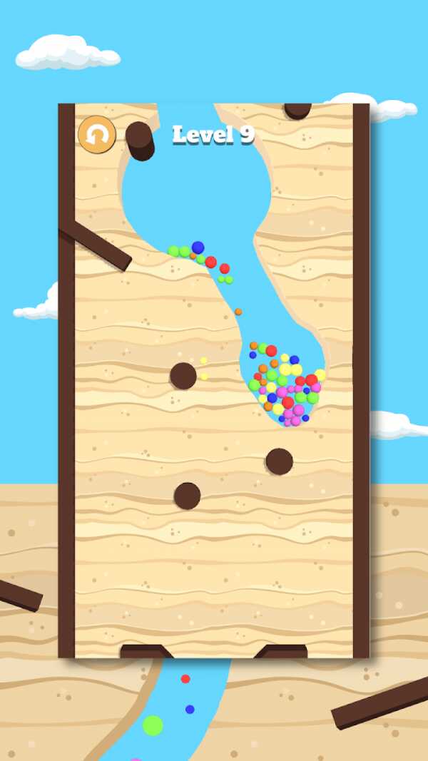 注意每一次挖沙只有一次机会,且需要所有的球球都能落入指定位置,注意游戏关卡要求。