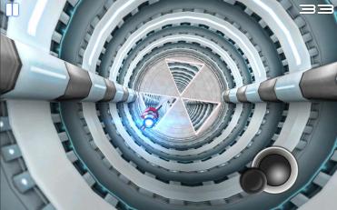 3D的科幻风格画面。主场景是一根伸向无限远的隧道,隧道的材质贴图和光影效果做得都相当不错。在游戏中,隧道的风格会随着游戏进度而进行变换。一些布局上的小细节也增加了许多游戏的小乐趣。如:旋转布局的灯