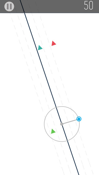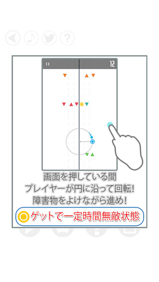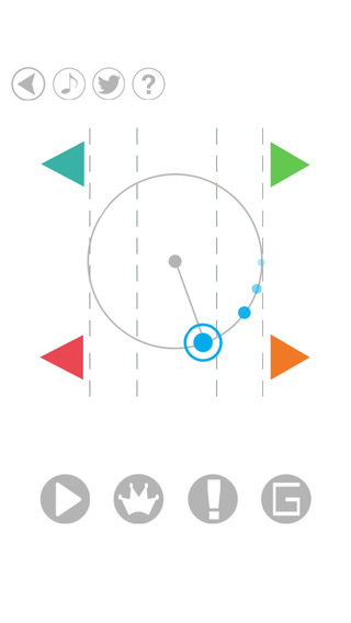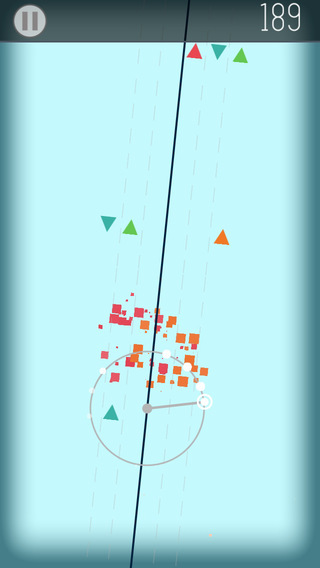 游戏玩法很简单,选择界面左下方的三角形按钮进入游戏,随着游戏的开始,被线条拖动的球状物会一直向前移动,当玩家触碰屏幕时就会顺时针围绕中线旋转。游戏中玩家的唯一任务就是要控制小球通过旋转避开所有的障碍物,碰到任何色块马上Game Over。当拿到途中闪烁的道具,小球会无敌化,并能击碎所有障碍物!