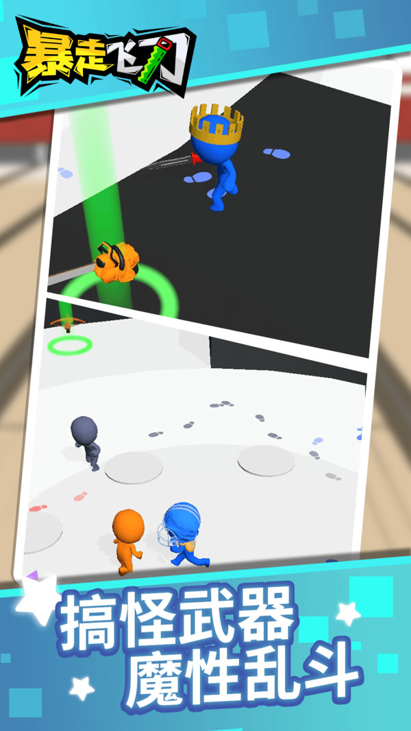 暴走飞刀是一款卡通动作休闲类游戏,玩家需要在对局中躲避场景里的障碍物,获得搞怪而魔性的武器,获得属于自己的王冠,淘汰对手,让自己的成为最后一个站着的小人。