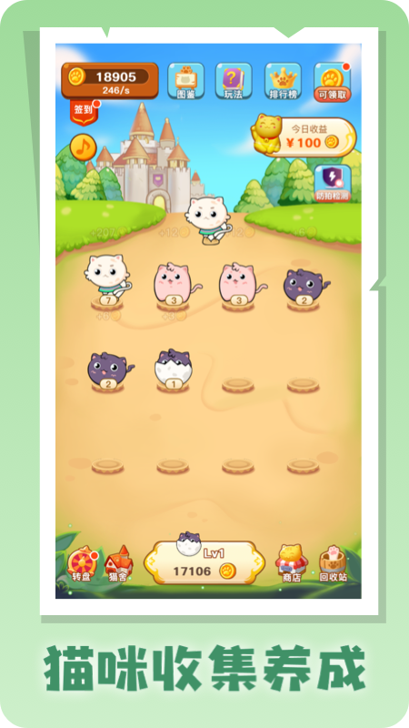 3、不断的升级,合并更多的猫咪,快乐的玩耍,随时利用零散时间突破极限。