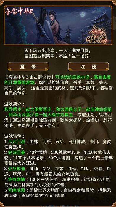 和乔帮主一起大闹聚贤庄,和大理段公子一起追神仙姐姐,和华山令狐少侠一起大战东方教主,浪迹江湖,纵横四海!通过奇遇得到独孤九剑,乾坤大挪移,神功在手,天下你有!