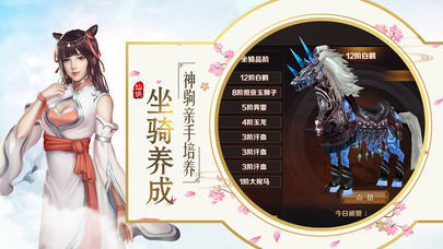 拉风坐骑、霸气神兵、酷炫法器、绚丽仙羽、乖萌宠物和威风剑阵六大进阶系统