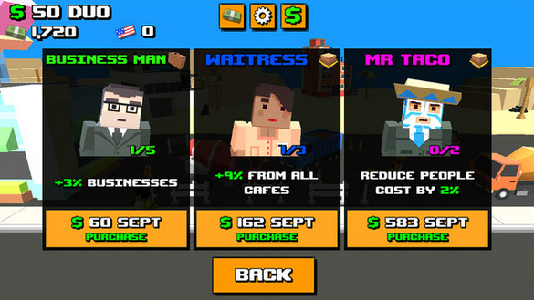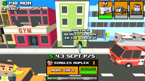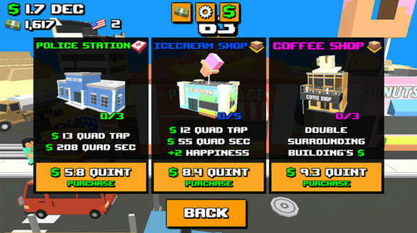 而每一种建筑都会有不同的点击收益加成,如冰淇淋商店可以增加幸福感、汉堡包商店能增加全部商店的收益等等,这些建筑都可以通过消耗金币进行升级获得更多金币收益和效果加成。