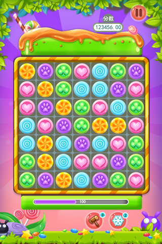 玩法和普通的三消除没有多大区别,三个或者三个以上的的相同糖果就可以消除了,一次性消除的越多,分数就会越多,并且上涨幅度很大,屏幕最上方是分数显示,下面有道具显示,可以看到当前能使用的道具,最下面的进度条可以看到关卡完成进度。