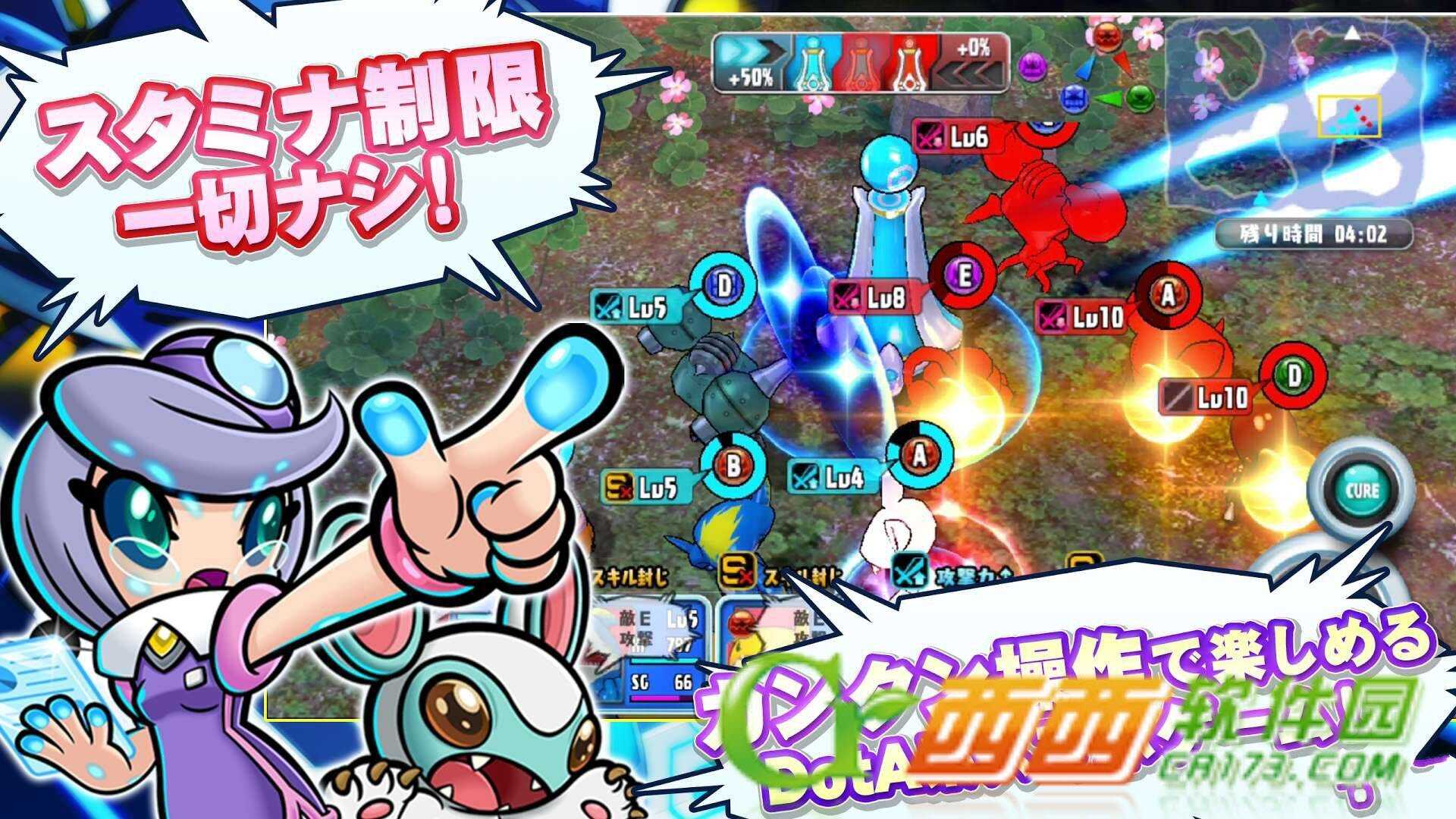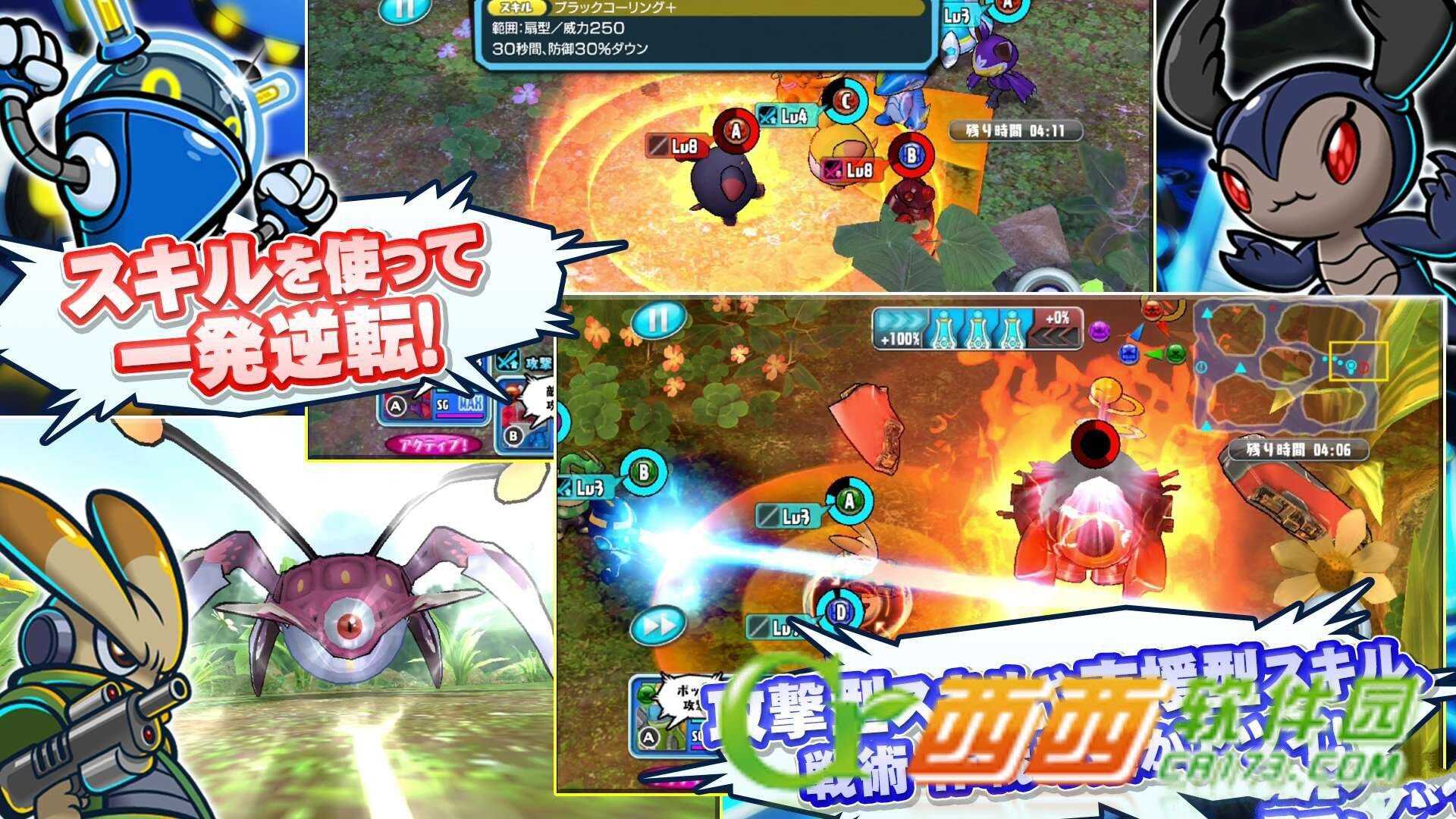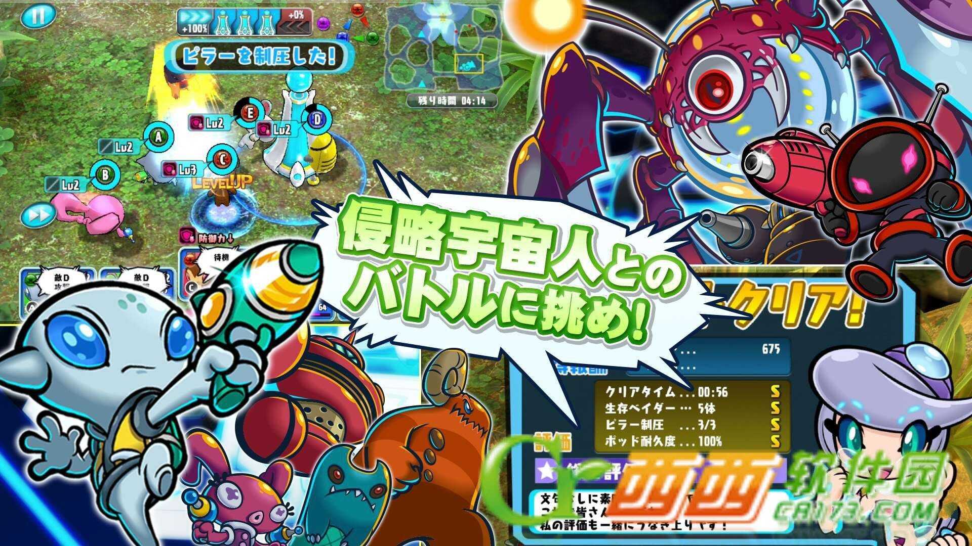 关卡任务基本上会采取实时战斗方式进行,各位可以对自己的宇宙人下达前进目标或是攻击对象等指示,藉此来完成各关卡任务所设定的敌人全体歼灭或是据点破坏等胜利条件。而游戏更有针对队伍全员下达命令的“一齐命令”选项,或是让宇宙人各自展开行动的“自动战斗”功能来轻松享受本作的战斗操作乐趣!此外,在关卡上还会有各式各样名为“柱”的建筑物存在,当宇宙人部队压制了这些建筑物之后,可以得到例如像是回复效果或是能力提升等各种加成效果,让战斗变得更加有利!
