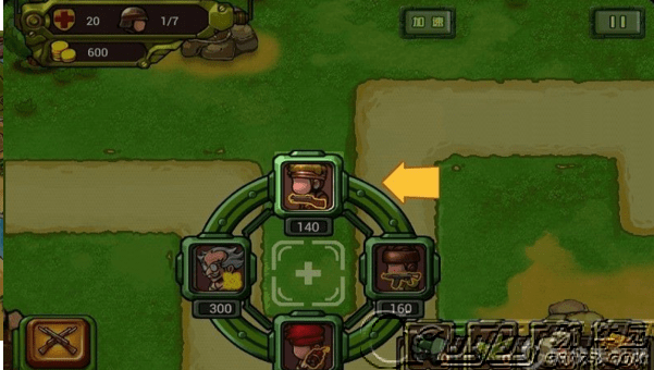 在己方阵营中排兵布阵,每回合自动出兵,兵种自动进行战斗