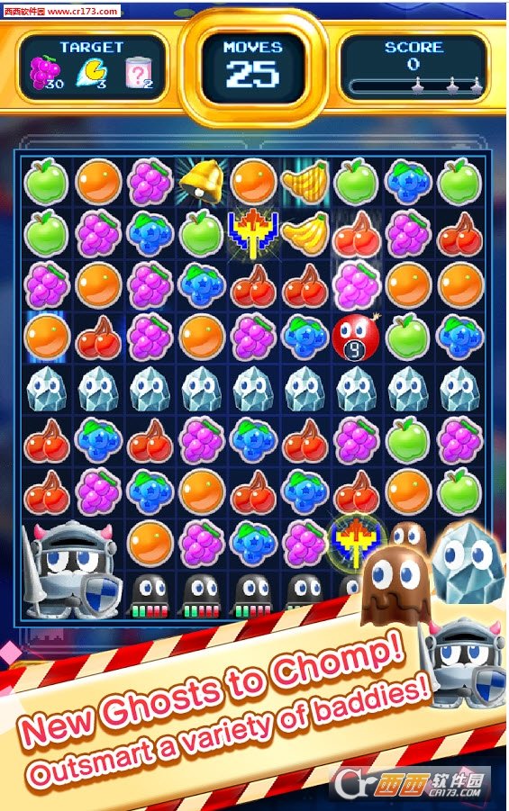 它是以消除玩法作为主题而展开的益智休闲小游戏,可以为大家的休闲时光带来无限的欢乐。游戏中,玩家需要帮助萌萌哒的吃豆人通过匹配相同相同水果进行消除的方式来从幽灵怪物那里夺回美味的水果,游戏采用闯关方式,难度会越来越大,大家可以来试试!