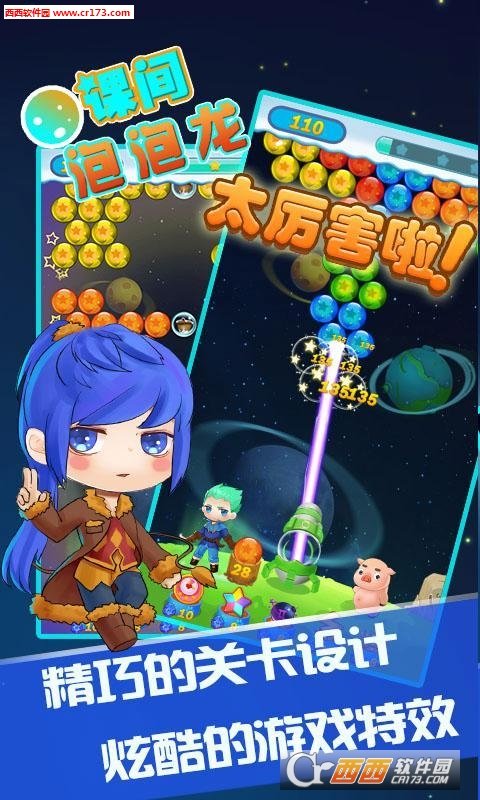 课间泡泡龙的画面效果精美,而且游戏里会有着各种各样的关卡,另外游戏里的玩法也非常有趣,所以喜欢消除游戏的玩家赶紧去试一试吧。
