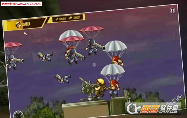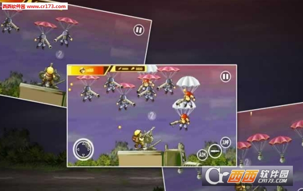 玩家可以控制炮台等武器,面对从空中降落不断攻击你的敌人,尽情射杀!通过点击屏幕对应按钮可以跳跃、射击、抛掷手榴弹等。杀死敌人,不断前进吧!