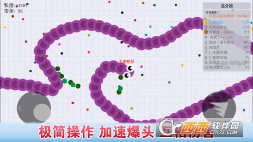 3.长按加速键,用巧妙的走位让蛇身被别人撞上,U型包围、小蛇狂奔、联盟围堵,逗趣好玩的策略战斗让你瞬间逆袭!