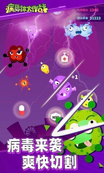 玩家可以通过指尖划过消灭冠状病毒,保护即将被入侵的肺脏,最终打赢病毒阻击战.该游戏旨在提升防疫宣传效果,增强居民防控意识,丰富玩家"宅"家生活.