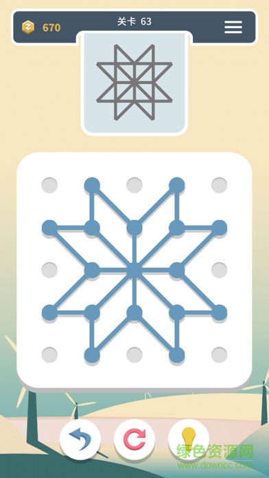 拉出任何线段并将其固定到一个点上,以将其分成两个新的线段; 新的线段可以继续划分。 重复地,一些普通的线条可以编织出无数种精美的图案。 一些图形看似简单但有趣,而另一些则看似复杂但规则。 您只需要简单地观察并尝试一下,然后再完成一个有趣的级别。