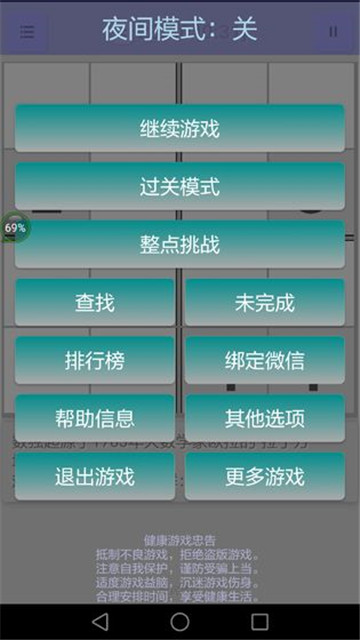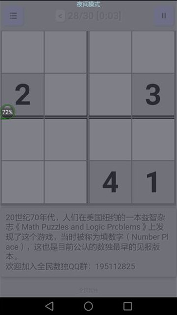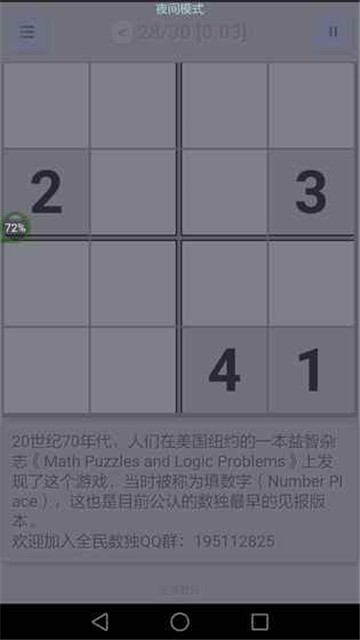 全民数独安卓版是一款界面简洁、体积小巧的数独游戏,拥有4宫、6宫等入门级玩法以及更加高级的数独玩法,基本上能够支持绝大部分的数独爱好者,另外这款游戏内拥有最简单直观的教学模式,如果不没有接触过数独但是想了解,那么这款全民数独游戏再适合不过了,基本上上手只要30秒。