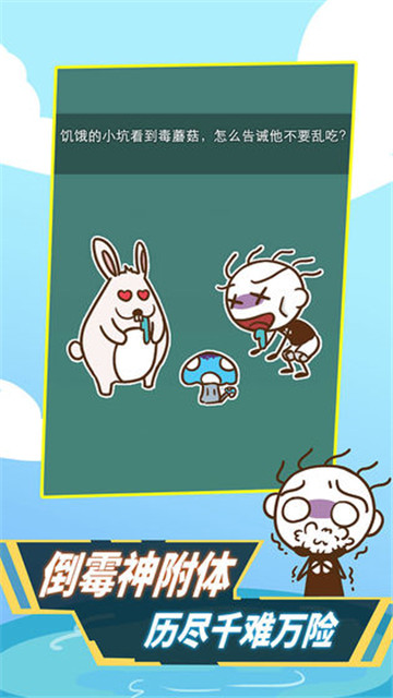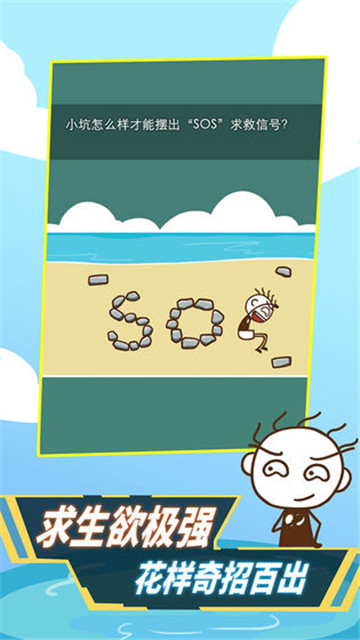 史小坑活下去为趣味性的解谜游戏,玩家的主要目标是拯救主人公史小坑。玩家一开始落难到荒岛上,不断遇到各种倒霉搞笑的事情,每一关史小坑都需要解决一个生存上的难题,缺水断粮、面临危险,遭遇野人,要解决各种问题,才能在岛上生存下去。核心玩法:以问答加操作的形式表现,每个关卡只有一个过关方式。