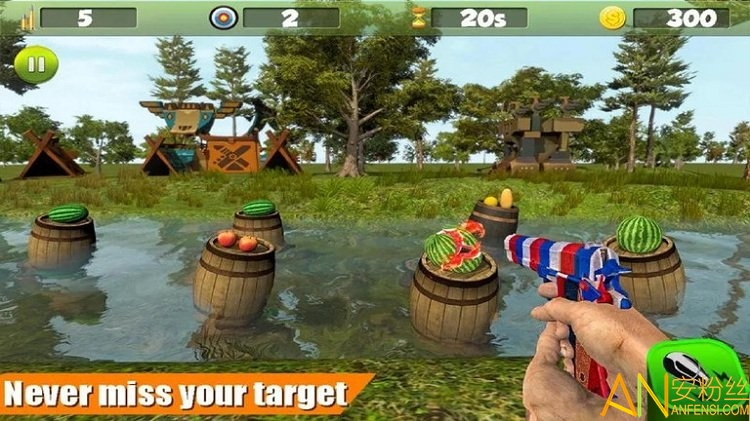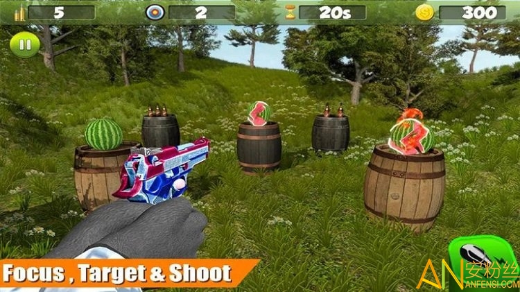 1.丰富的挑战玩法,精准的射击挑战,瞄准不同的水果,开始射击,逐渐增加的距离