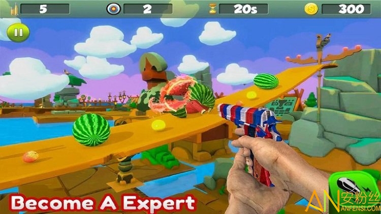 1.第一人称的视角展开挑战,瞄准传送带上的水果并用子弹把水果串碎即可获得更高的游戏分数