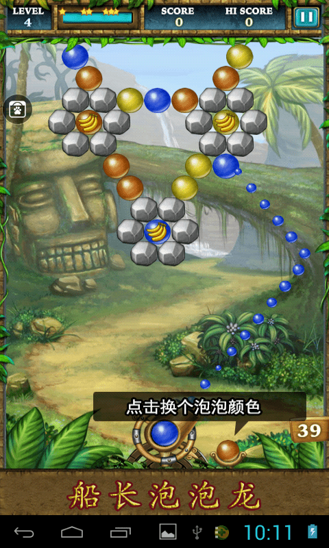巧妙设计发射角度,击破次序,用最少的泡泡通关。可以获得三星评价,获得额外奖励。 可以选择金币兑换道具,提高效率。