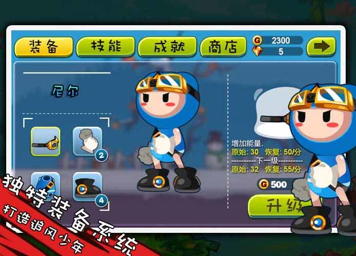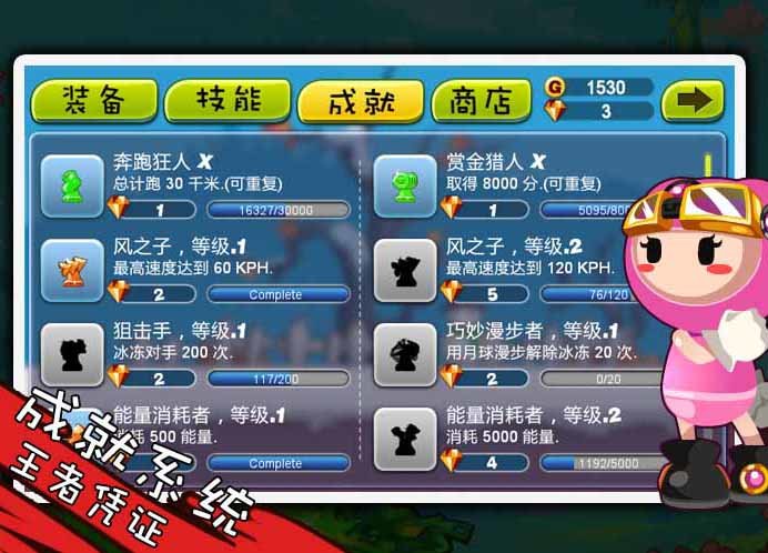 游戏开始前会告诉玩家需达到多少名次才可以获得星星奖励,最多为三颗星,星星可以用来兑换商品或解锁关卡。每一小关结束后,系统会分析场次、时间、奖金等等,另外针对名次会给予星星奖励。玩家可以在商店中升级装备或者是提升能力技能等。例如装备升级,每次升级都可以提升该装备的素质,如升级帽子可以增加移动时速等。