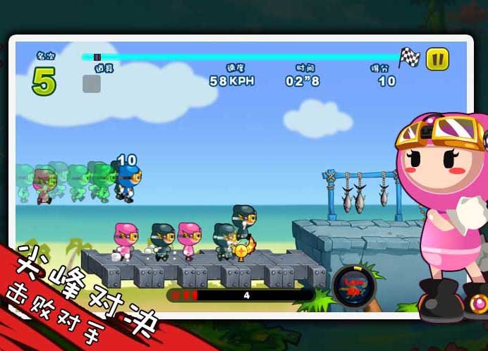 游戏是一个竞速跑酷游戏,每次关卡开始时候会有孩童与你同台竞技,在悬浮的竹梯上和道路上会不时出现不同的道具,蓝色的乌龟吃到后可以点击屏幕发出冰冻弹,击中前面的红衣孩童会让他们瞬间停止。场上还有红色的花朵可以加速,黄色的花朵可以增加弹跳能力。