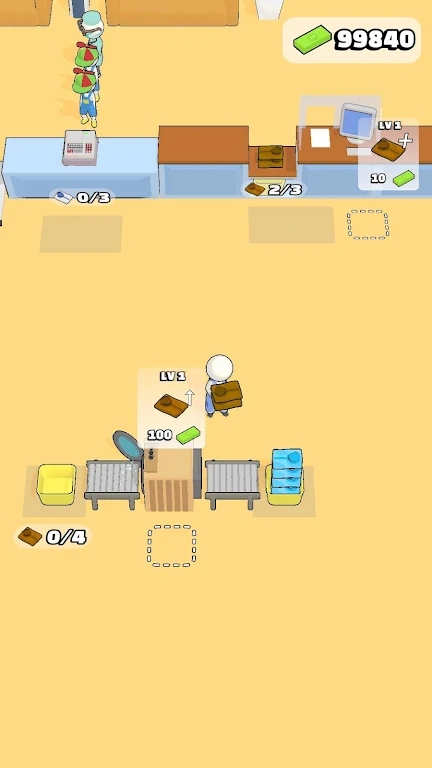 1、滑动屏幕,控制小人移动,在不同的功能区中小人将会有不同的工作需要完成。