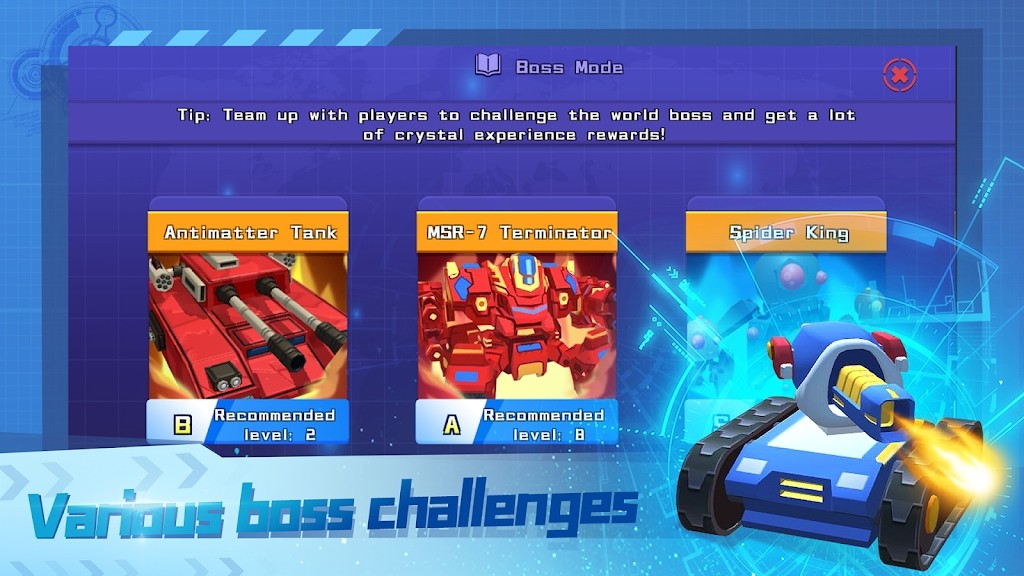 1、这作为一款q版风格的休闲射击竞技手游,在游戏里玩家驾驶坦克,火力无限。