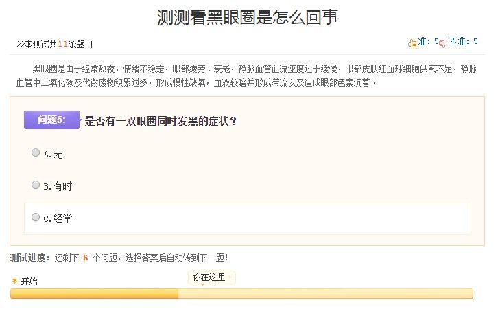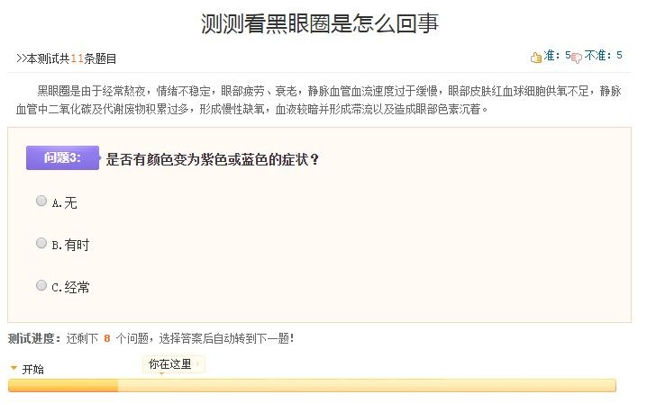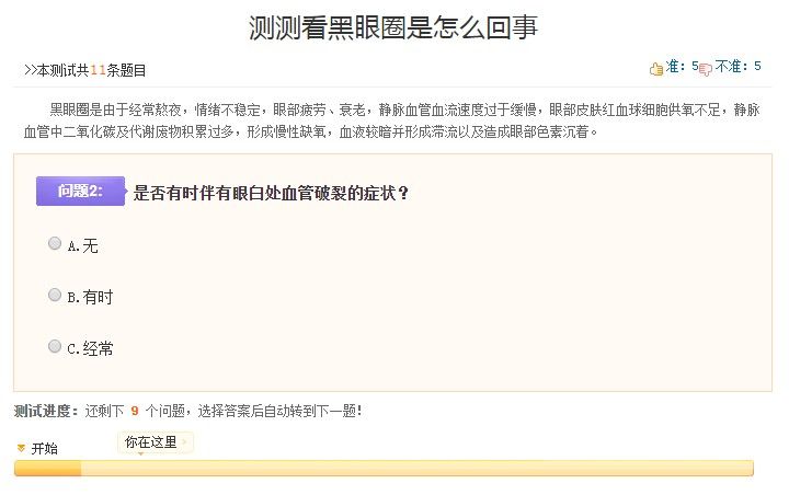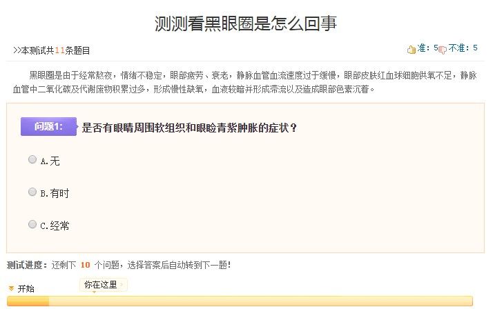 3、玩家需要通过11道题目的测试,比如你的眼圈是否经常发黑?都会伴有血管破碎的症状。