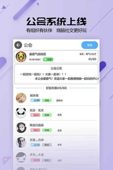 多人玩家参与竞技打造最强的推理冒险,自由匹配进入游戏世界参与角色扮演,实时语音的开启展示你口才的时刻到来了,在这个拼演技秀口才的年代你能否从万千玩家中脱颖而出呢,快速的进行匹配进入房间一展你的个人才华吧!