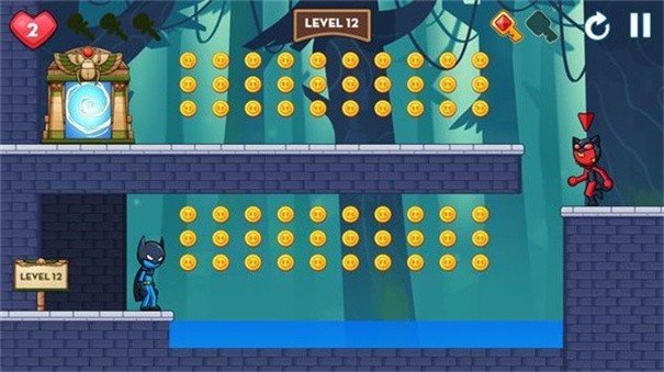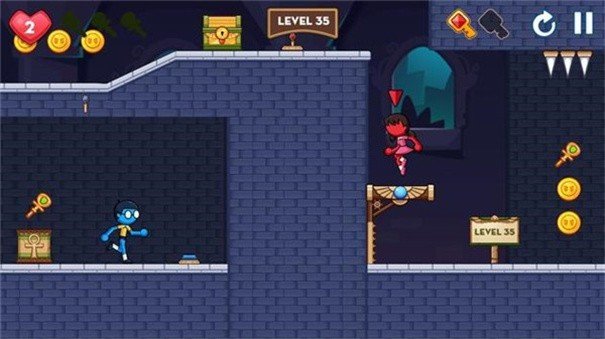 火柴人双王是一款双人闯关类手游,游戏和森林冰火人非常的类似,在这里要完成闯关就需要进过各种关卡障碍的考验,在这里有玩家可以通过解锁更多的宝箱来获取道具奖励,这些道具能帮助你闯关冒险,同时收集这些金币在后续商城中兑换各种好看的装扮,游戏可玩性很强,喜欢的小伙伴来96u下载吧。