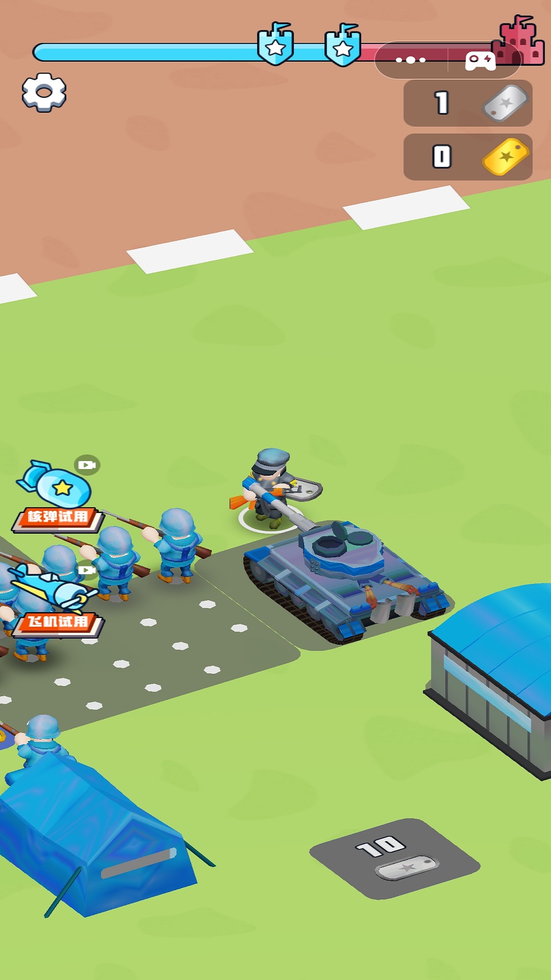 玩家在游戏中需要搭建自己的兵营用于士兵招募,当招募的士兵抵达上线时,可以派遣士兵对敌军进行袭击,当你消灭了所有的敌人,即可将敌方旗帜降落,升起我方旗帜!