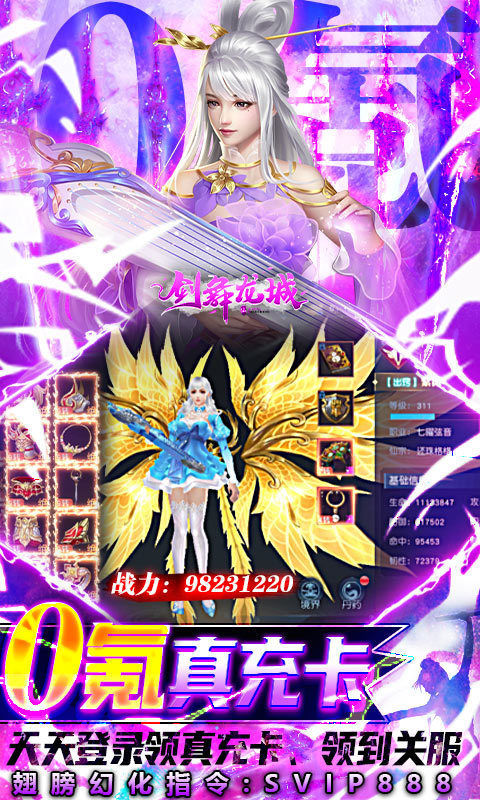 1.充值比例1:10000,上线送VIP7,36万元宝,进阶礼包(可选)*20,神装钥匙*20,100元真充卡,3888万金币。