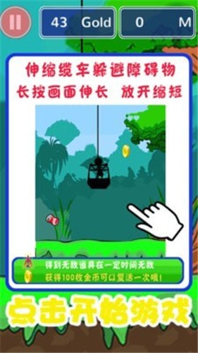 开心缆车是一款跑酷冒险类游戏。在神秘的森林中,玩家通过控制缆车的升降来躲避飞行中的小鸟和地上跳跃的足球等,途中还有金币等你来吃,更有无敌状态让你瞬间无敌。通过获得足够多的金币,获得复活的机会,继续冒险,一次一次超越自己,打破自己的记录。伴随着动感的音乐、绚烂的色彩,在充满神秘的森林中乘着缆车疯狂的开心的奔跑吧!兄弟!赶快来吧!